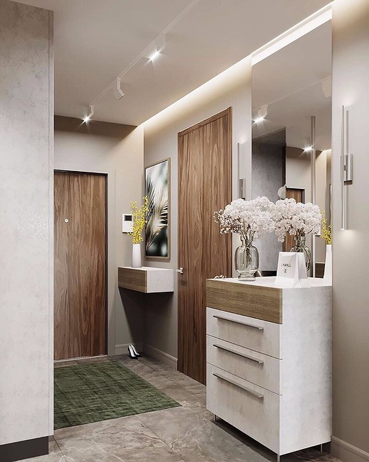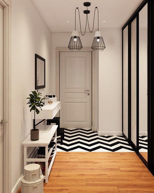 2. Микро-коридор. Если для коридора в квартире отведен буквально небольшой уголок, используйте его с максимальной пользой: поставьте мини-пуф, повесьте узкое зеркало, поставьте журнальный столик. Иногда даже из скромного помещения можно многого добиться.