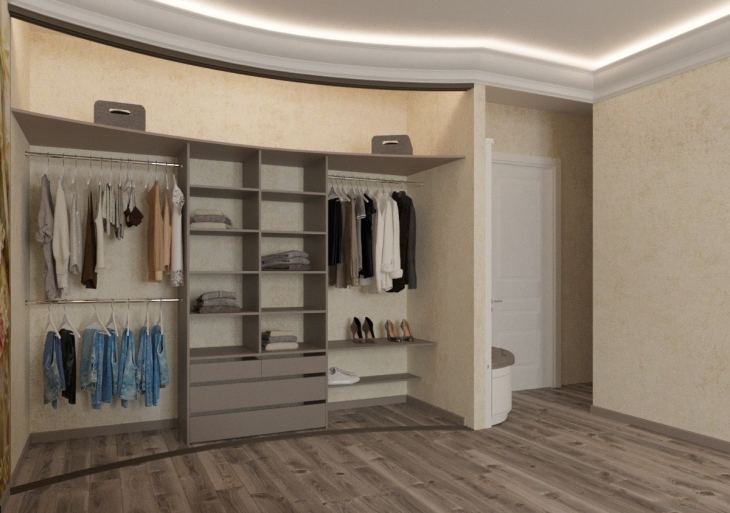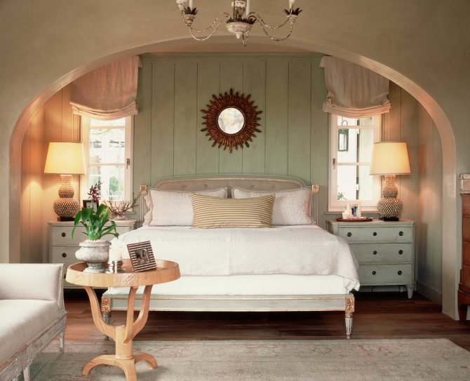 Полки или шкаф добавят практичности дизайну. Гардероб можно разместить в большой нише. На узкие полочки поставьте свечи, сувениры, фотографии, книги. Дополнит дизайн спальни мягкое освещение в глубине ниши. Уголок с мягким сиденьем для чаепития или чтения — хорошая идея. В последнем случае потребуется яркая лампа.