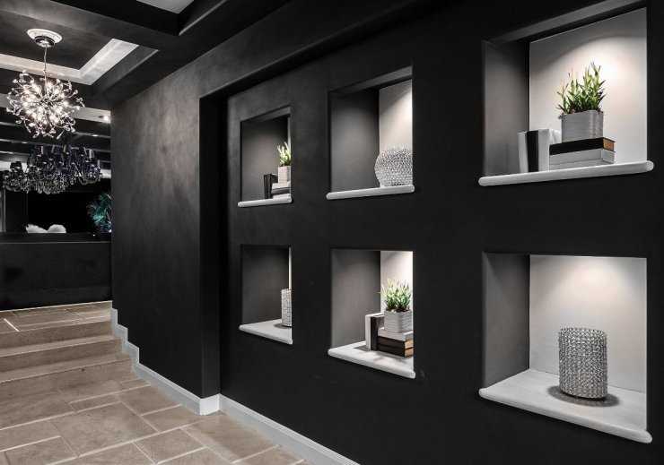 Для отделки ниши в стене используются разные стройматериалы. Им оборудуют подсветку в виде бра, точечных светильников или цветной светодиодной ленты.