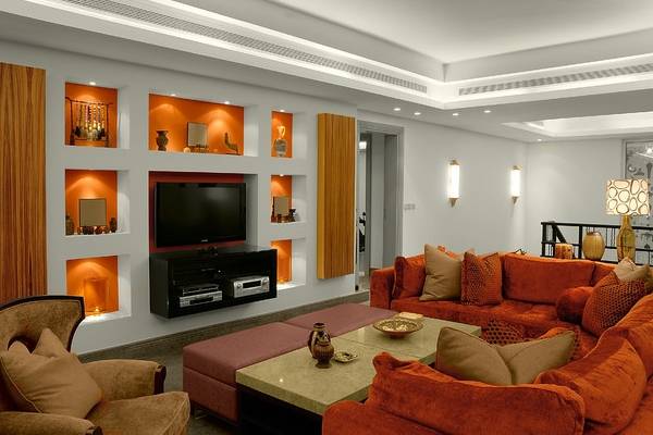 В гостиной можно использовать большие ниши для аудио- и видеотехники. Оригинально будет смотреться поверхность стен с небольшими симметричными углублениями для книг вместо надоевших полок, а в центре — большая ниша для телевизора, однако такую конструкцию ниши лучше всего использовать для больших гостиных, поскольку создание такая конструкция будет занимать около 40 см места в комнате.