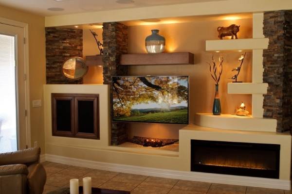 Ниши с подсветкой, фото в рамках, книги, награды, картинки — самые распространенные варианты формата. Что еще можно сделать на стене? Эта конструкция, которая хорошо сформирована из искусственного камня, — отличное место для организации электрического камина и друга — ее можно использовать для прерывания звука