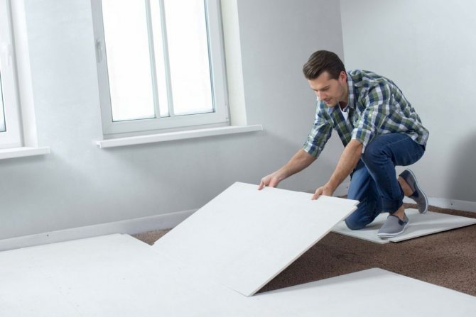 - Гипсокартон не кладут на пол в качестве чернового слоя, так как он не обладает достаточной прочностью, а гипсокартон выдерживает эксплуатационные нагрузки в помещении.