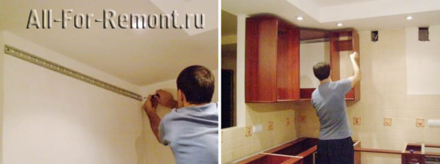 - Замеряем высоту крепления верхних точек шкафов, делаем отметки на стене с двух противоположных сторон.