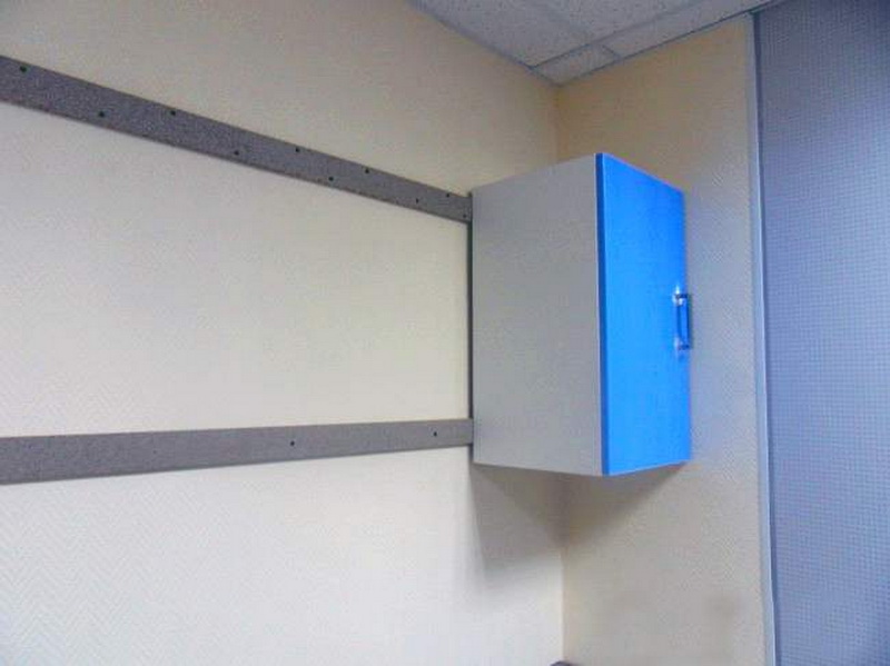 Горизонтальная направляющая монтируется по всей длине стены, к которой будут подвешиваться шкафы. В результате все внимание сосредоточено на надежности его крепления, поскольку мебель висит на нем и не имеет контакта со стеной.