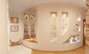 Конструкция полок может быть любой. Для сборки криволинейной конструкции (арочной, круглой и т.д.) необходимо использовать специальные профили, которые можно гнуть по любым контурам. ГКЛ не требует сложной подготовки, любой детали легко придать небольшую кривизну, а для сильной кривизны материал следует лишь слегка смочить водой. Встроенные полки и перегородки из гипсокартона можно облицовывать теми же материалами, что и стены и потолок, без особых усилий создавая гармоничный интерьер.