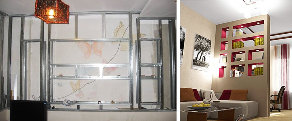- Отсутствие звукоизоляции. Если полка выполняет функцию перегородки, то через нее будут слышны все звуки. Для хорошей звукоизоляции необходимо установить в интерьере дополнительный материал. Например, минеральная вата.