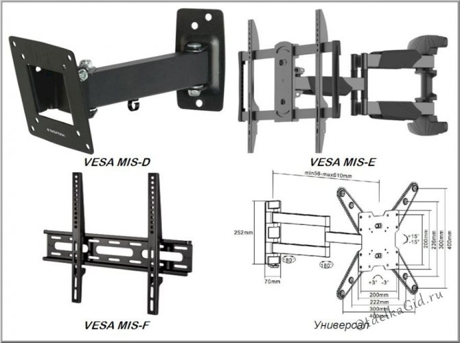Вывешивание осуществляется по ряду правил. Нарушения приведут к тому, что фиксация будет ненадежной, и в результате устройство может выпасть. При выборе подходящего кронштейна учитывайте, что все современные крепления производятся в соответствии с международным стандартом VESA (Video Electronics Standards Association), который определяет последовательность крепежных отверстий на кронштейне и на телевизоре.