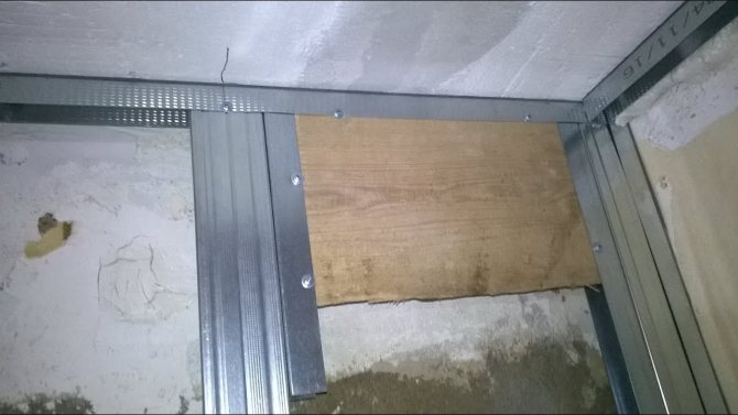 - На внутреннюю поверхность профилей укладывают брус или массивную доску. Через боковую часть профиля саморезами фиксируется деревянный элемент.