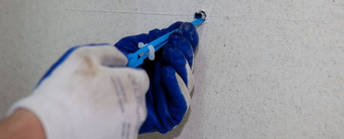 - Сначала аналогично предыдущей операции делаются разметки, затем просверливается гипсокартон.