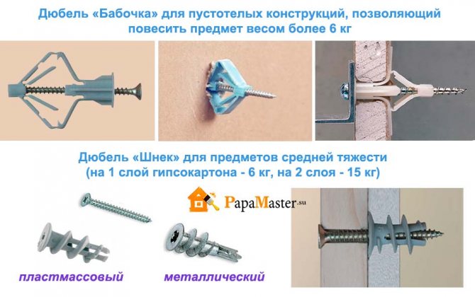 Сорта Молли, Баттерфляй и Хартмут предназначены только для полых конструкций. Это необходимо для того, чтобы опорную часть протолкнуть в отверстие. За гипсокартонной обшивкой должно быть достаточно места для размещения анкерной части дюбеля.