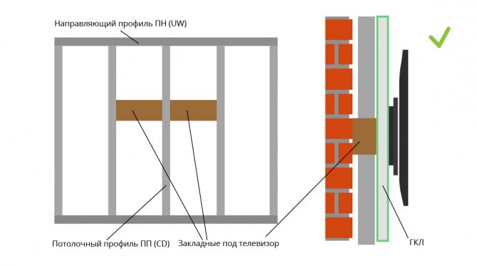 Если идея телевизора на стене возникла на ранней стадии ремонта, то это «вдохновение» можно считать большим успехом. В этом случае перед обшивкой стен листами гипсокартона на каркасе размечается место, отведенное под телевизор. Затем армируют металлическим каркасом (каркасом), состоящим из армированного профиля или с несколькими закладными деревянными элементами, однако некоторые мастера считают «вариант профиля» лучшим решением.