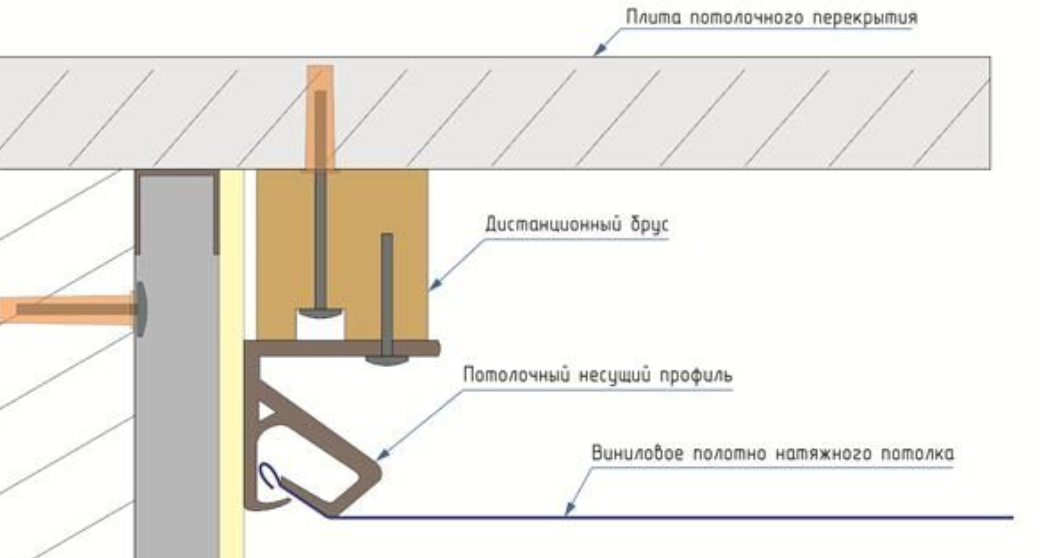 - Если потолки в комнате имеют сильную кривизну, а пленочную конструкцию по той или иной причине нужно сильно опустить, профиль можно закрепить с помощью распорок из деревянных брусков подходящего размера.