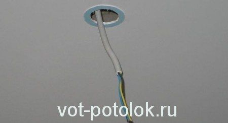 Когда короб для натяжных и гипсокартонных потолков готов, его можно красить водоэмульсионной краской. В центре пересечения диагоналей потолка закрепляется монтажный крюк для люстры и пропускается осветительный провод. Он вставляется в гофрированную пластиковую трубку и фиксируется к пластинам с помощью хомутов.