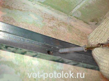 Для равномерного распределения растягивающего усилия по всей площади закладного элемента крепежные винты ввинчиваются на расстоянии не более 100-150 мм. На всех угловых участках помещения и на стыках несущего профиля саморезы устанавливаются в пределах 20 мм от торца профиля.