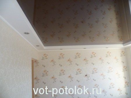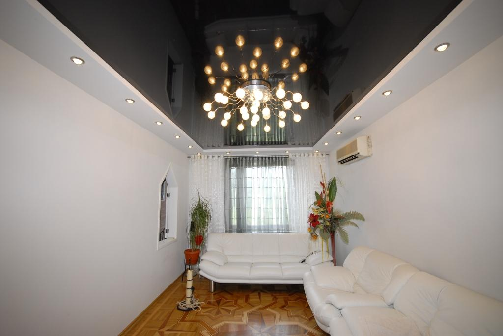 Коробка будет представлять собой второй уровень натяжного потолка, к которому крепится глянцевый натяжной потолок. Пленка ПВХ располагается на минимальной высоте от бетонного пола — 3 см. В центре планируем люстру, которую нужно будет установить в потолке.