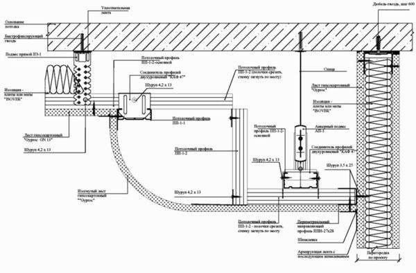 Используя стандартный настенный профиль, можно легко собрать двухуровневую потолочную конструкцию. Понятно, что по линии установки багета необходимо закрепить дополнительный армирующий профиль.