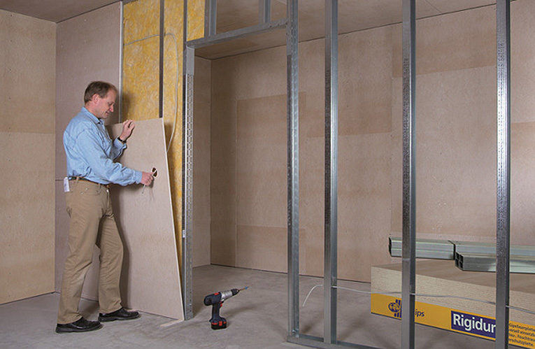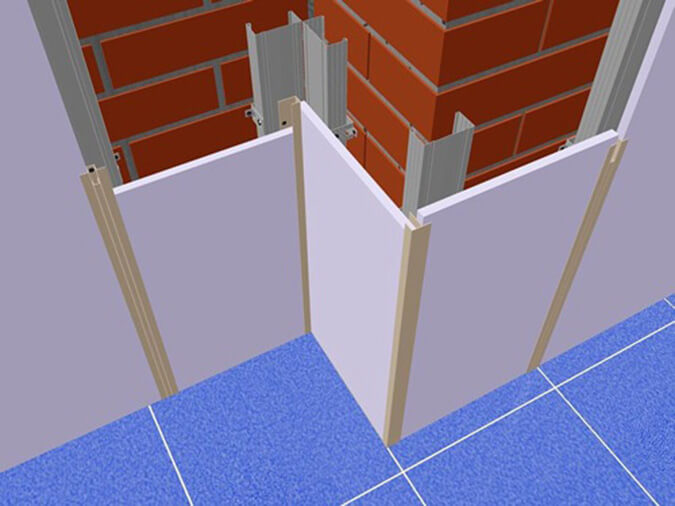 ГКЛ часто используют при отделке различных помещений. Этот материал состоит из двух листов картона, между которыми находится слой затвердевшего гипса. К черновым стенам крепятся алюминиевые профили, которые между собой соединяются специальными элементами — «крабами». К каркасу прикручиваются листы гипсокартона. Такая отделка позволяет быстро получить ровную поверхность.