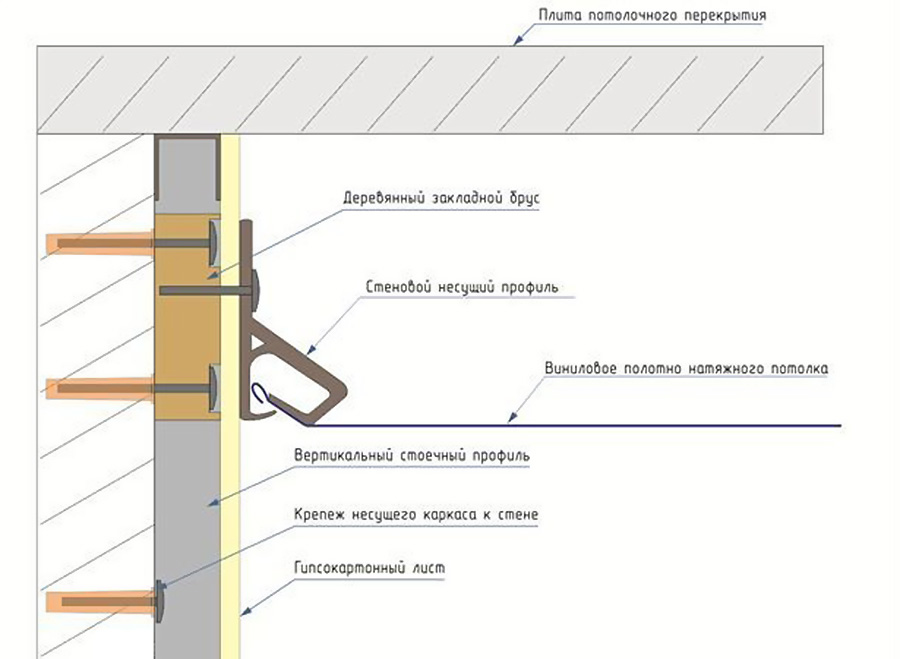 Но при соединении натяжного потолка со стенами из гипсокартона возникают определенные сложности. ГКЛ — не очень прочный материал и поэтому не выдержит стандартного брезентового крепления. Саморезы просто оторвутся от стены. Поэтому требуется предварительная подготовка и укрепление конструкции.
