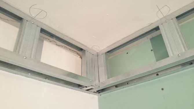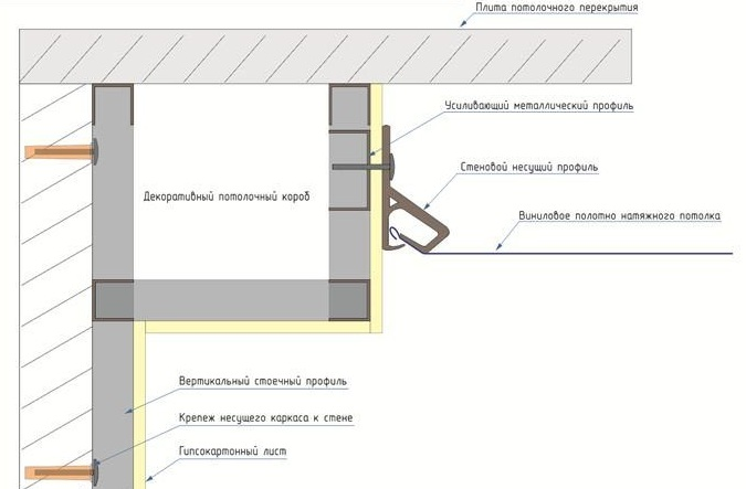 Каркас обшит гипсокартоном. Затем к коробу из гипсокартона крепится натяжной потолок:
