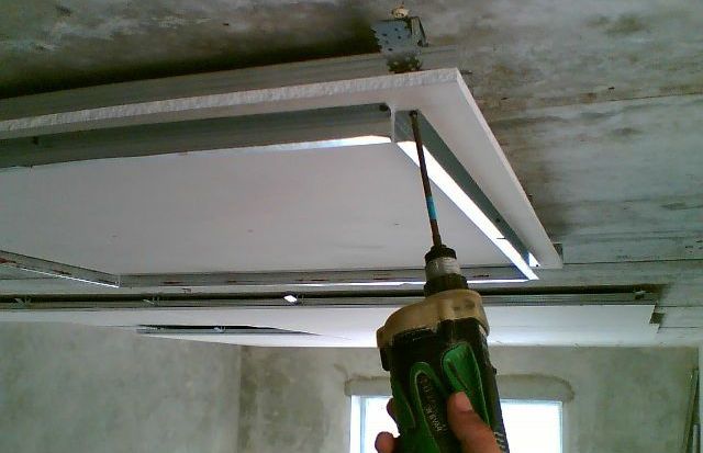 В результате у вас должна получиться решетчатая коробчатая конструкция. После завершения монтажа каркаса устанавливаются листы гипсокартона. Для этого на листе потолочного гипсокартона размечают карандашом и линейкой. Лист разрезают с одной стороны по разметке канцелярским ножом и разламывают. После этого его полностью обрезают.