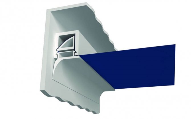 - Кулачковый зажим или замок. В этом случае край пленки прижимается шпателем внутрь двухстороннего монтажного профиля.
