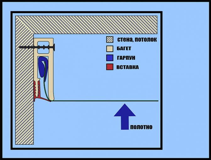 Полотно заправлено в багет с круглым профилем. Порядок заправки следующий: углы — стены. Для крепления в паз багета к краю полотна приваривается гибкий «гарпунный» профиль. После продевания полотна на место крючка люстры приклеивается специальным клеем защитное кольцо.