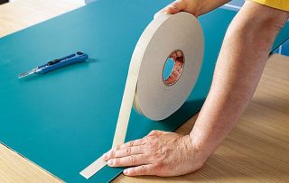 - Наклейка двустороннего скотча. Ленты приклеиваются вертикально прерывистыми и непрерывными линиями так, чтобы они совпадали с краями листов, чтобы провести предварительную разметку. Прерывистые ленты располагаются длиной 70 мм с шагом 200 мм и расстоянием между вертикальными полосами не более 200 мм.