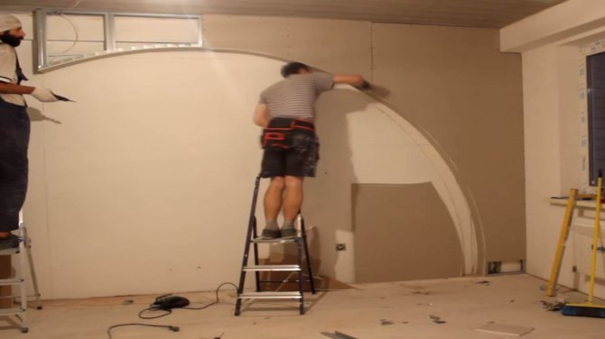 Не забывайте, что конструкция криволинейная, поэтому перед тем, как сшить ее гипсокартонами, материал необходимо разрезать на необходимые фрагменты.