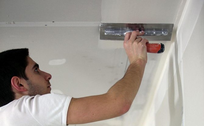 Основными инструментами будут шпатели. Лучше выбрать два из них, один из которых будет основным, а другой вспомогательным. Необходимо будет подготовить гипсокартон к оштукатуриванию грунтовкой, которую наносят кистью или валиком. Если высохшая поверхность после оштукатуривания стен из гипсокартона окажется однородной, состав нужно будет обработать болгаркой.