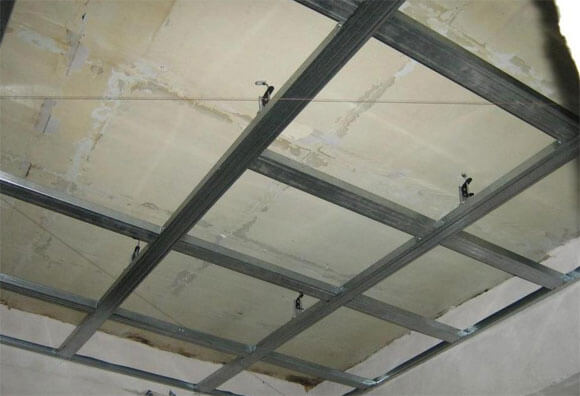 Перед сборкой каркаса для крепления гипсокартона к потолку нужно тщательно замерить места крепления профилей. Следует помнить, что минимальное расстояние от базовой поверхности потолка до внутренней стороны гипсокартона равно толщине используемого профиля.
