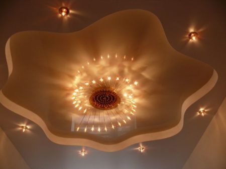 Перед тем, как приступить к монтажу потолка из гипсокартона, необходимо продумать и организовать воздушное пространство. Все провода и электрические кабели уложены в гибкие гофрированные трубки и закреплены металлическими скобами до черновой отделки. На гипсокартоне обозначаются зоны для расположения светильников, по контуру очерченной фигуры вырезаются соответствующие отверстия.