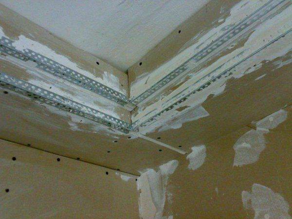 - Если нужно сделать углы прочнее и каждая линия четкая, стоит на перфорированные углы наклеить гипсокартон.