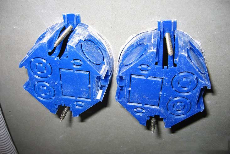 При монтаже розеток в гипсокартон нужно использовать специализированные монтажные коробки, называемые розеточными коробками (стаканами). Монтажные коробки для стен из гипсокартона отличаются от вспомогательного бетонного оборудования наличием в их конструкции специальных креплений, которые прижимаются к гипсокартону.