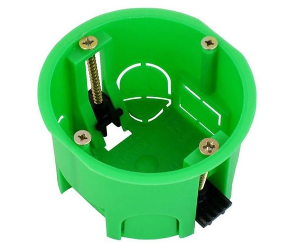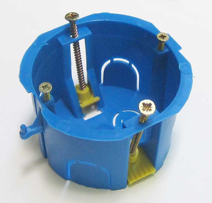 Розеточные коробки для гипсокартона производятся, как уже было сказано выше, по особому способу крепления. Внешне они похожи на пластиковый стаканчик. На лицевой стороне 4 винта. Двое из них выше остальных. Они необходимы для специфического крепления к стальному каркасу самой розетки.