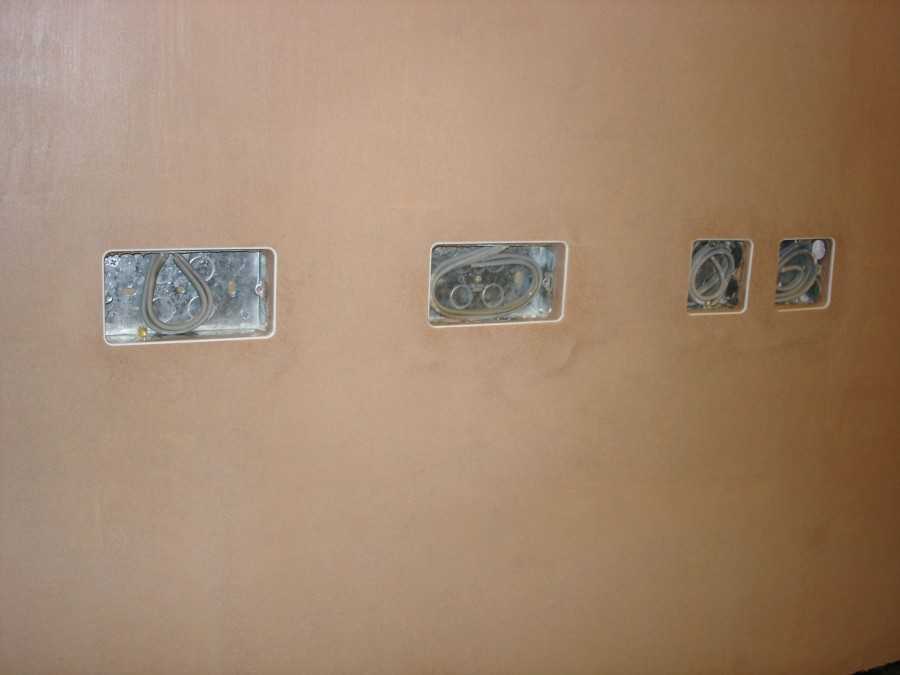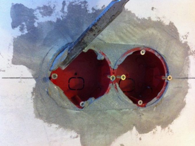 Если из розеточных коробок устанавливается блок, перегородки между отверстиями убираются на стене напильником.