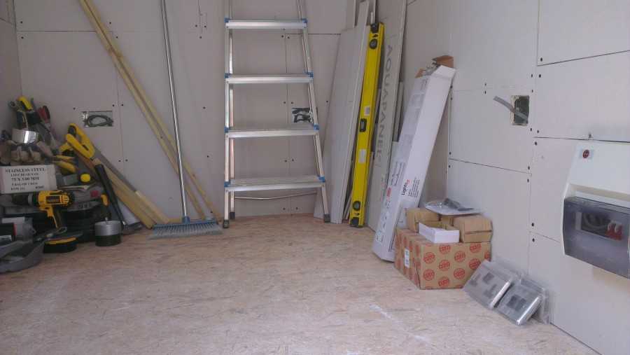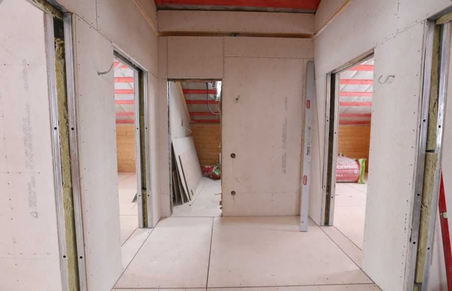 - Если делаем перегородку, то с одной стороны каркас обшиваем гипсокартоном. Мы будем использовать этот слой оболочки в качестве опоры при прокладке кабелей к розеткам.