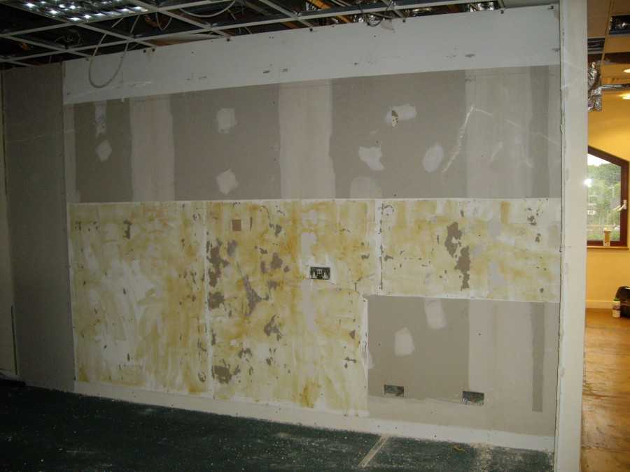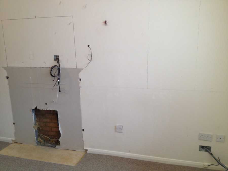 - Если гипсокартон приклеивается к стене бескаркасным способом, необходимо будет просверлить отверстие под стекло при помощи пробойника по бетону или дереву.