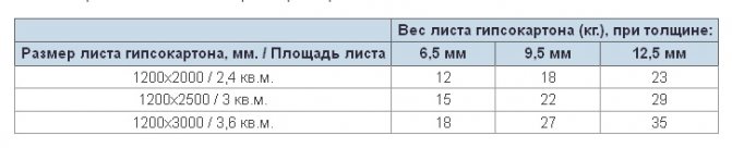 При толщине гипсокартона 6мм вес гипсокартона составит: