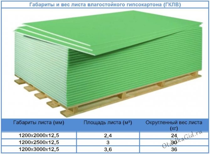 - Влагостойкий вид гипсокартона, как обычно, должен весить не более 1 кг на 1 мм толщины.
