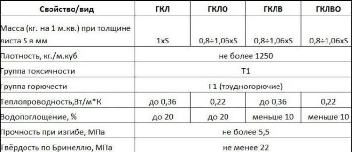 Параметры разных видов гипсокартона