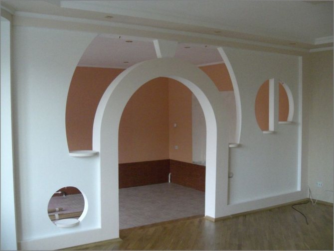 Для формирования внутренних конструкций используются специальные листы гипсокартона толщиной 6 мм. Они отличаются пластичностью, хорошо гнутся, поэтому часто используются для крепления гофрированных элементов декора. Но для установки арок такая толщина не подходит, так как не справится с нагрузкой. Следует отдавать предпочтение более плотным листам или укладке тонкого гипсокартона в несколько слоев.