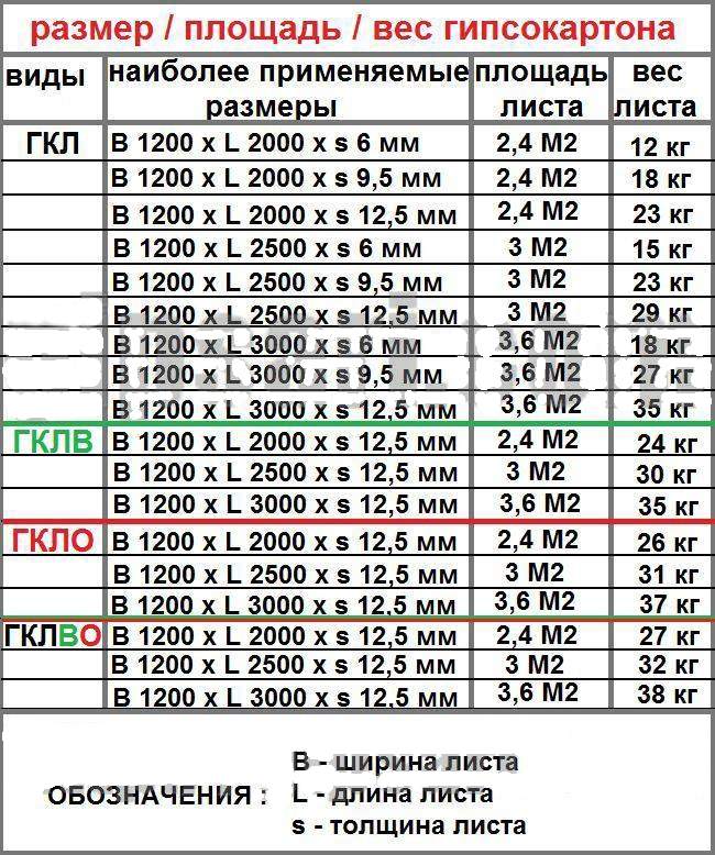 Таким образом, масса таких листов, как ГКЛ, ГКЛВ и ГКЛО, будет разной, даже с учетом того, что длина, ширина и толщина будут одинаковыми. На вес листов также влияет влажность окружающей среды, в которой они хранятся.