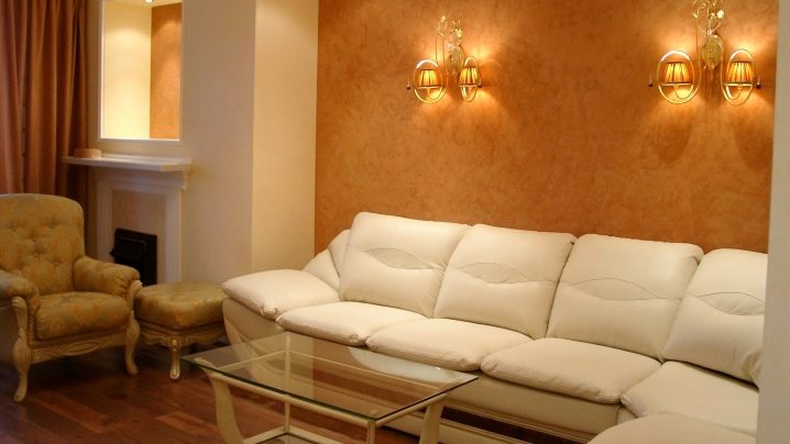 Венецианская штукатурка акцентно смотрится с обычным потолком (окрашенным или натяжным). Для изысканного настенного покрытия идеально подойдет художественный паркет или красивая плитка.